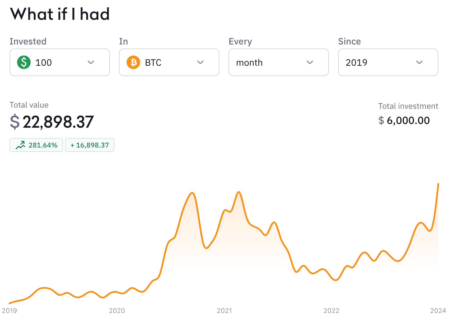 Als jij sinds 2019 maandelijks €100 in bitcoin had geïnvesteerd, had je nu 6K geïnvesteerd, maar een vermogen van 23K opgebouwd. Een gemiddeld jaarlijks rendement van 281%