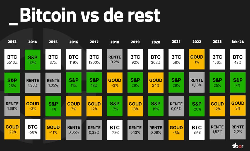 De isocronic deep house beats trillen door mn speakers terwijl ik deze intro voor je typ. T’is lastig: Probeer in een wereld waarin oneindig veel wordt aangeboden voor belachelijk hoge prijzen, maar eens de aandacht vast te houden met iets waardevols waar je geen geld voor vraagt. Toch is dat de insteek van deze wekelijkse mail. Hij moet je meetbaar veel geld, gezondheid en geluk opleveren. En wil je meer, dan kom je naar een van onze retreats of events. Oké, de intro is gelukt. De mail is wat langer dan normaal. En om de een of andere reden, blijft het een geheim voor de massa. — Ik heb hieronder het rendement van Bitcoin (BTC), het S&P500 indexfonds, goud en de Nederlandse spaarrente tegen elkaar weggezet. Maar ik herinner je eerst even aan de berichtgeving van de Nederlandse mainstream media over bitcoin de afgelopen 10 jaar: Kijk met die berichtgeving in je achterhoofd naar onderstaande feiten: